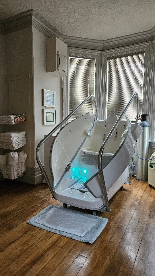 HOCATT stands for Hyperthermic Ozone and Carbonic Acid Transdermal Technology. This machine includes Ozone, CO2/Carbonic Acid, Steam Sauna, Far Infrared, Microcurrents, Oxygen Breathing and Photon Lights. Each session lasts 30 minutes.
